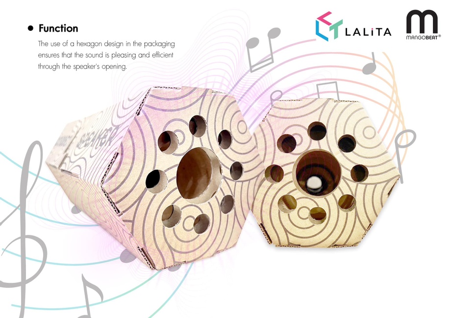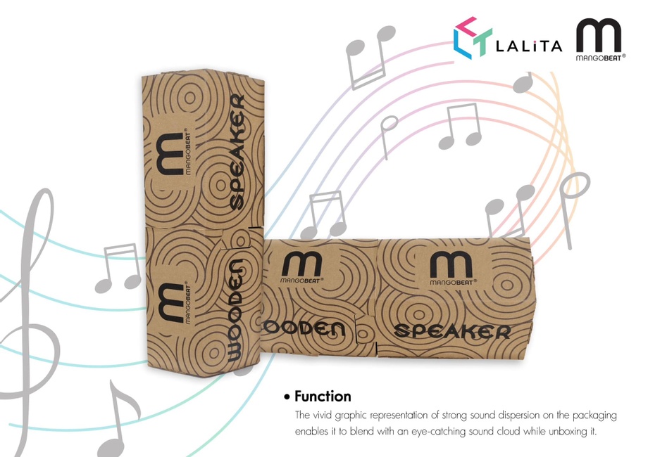 หัวใจสำคัญของ Wooden Speaker คือกลไก two-way slide mechanism ที่สามารถเปลี่ยนบรรจุภัณฑ์ธรรมดาให้กลายเป็นเครื่องขยายเสียงอะคูสติก ใช้คู่กับสมาร์ตโฟนหรือลำโพงได้ทันที การออกแบบได้รับแรงบันดาลใจจาก รังผึ้งหกเหลี่ยม (Hexagon) ซึ่งขึ้นชื่อในเรื่องความแข็งแรงและการกระจายเสียงอย่างเป็นธรรมชาติ ทำให้เสียงที่ได้กังวานและนุ่มนวลมากขึ้น อีกทั้งยังสอดคล้องกับแนวคิด biomimicry หรือการออกแบบที่เรียนรู้จากธรรมชาติอย่างแท้จริง